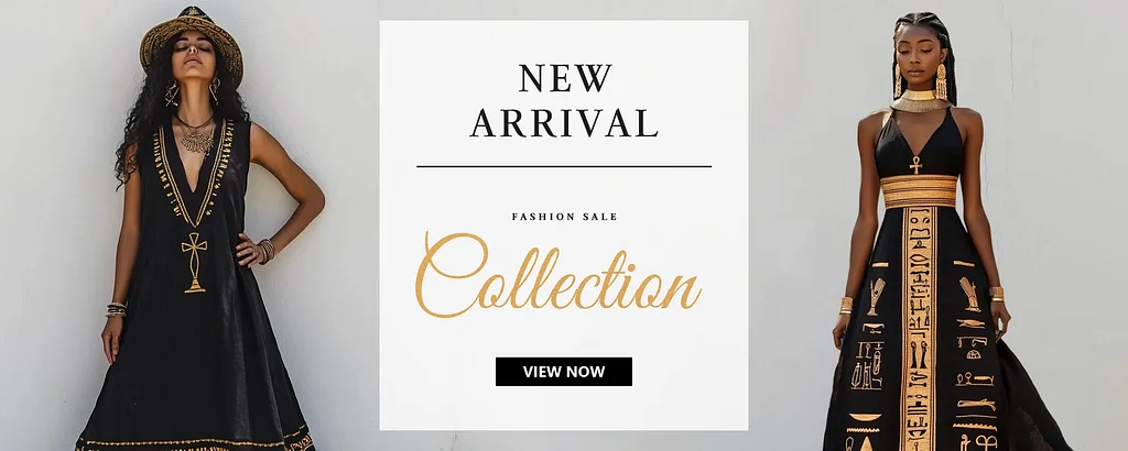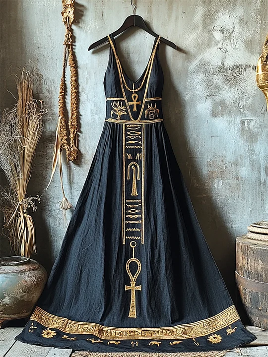 Elegant Ankh Ancient Egyptian Glitter Embroidered Linen Maxi Dress