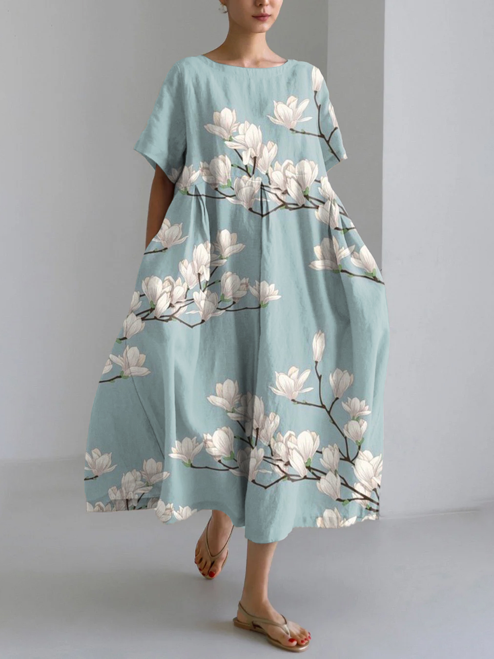Vintage Japanese Magnolia Flower Print Linen Blend Maxi Dress