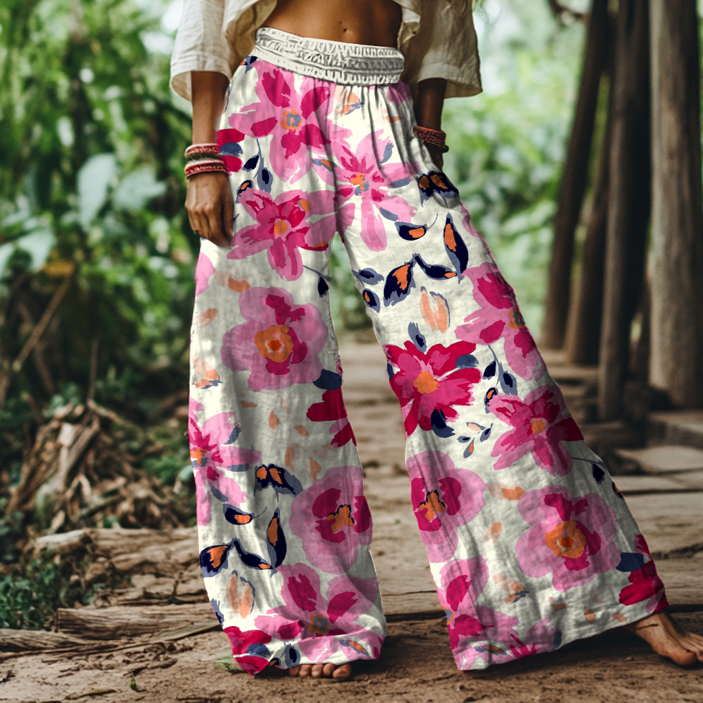 Vintage Watercolor Floral Print Loose-Leg Pants