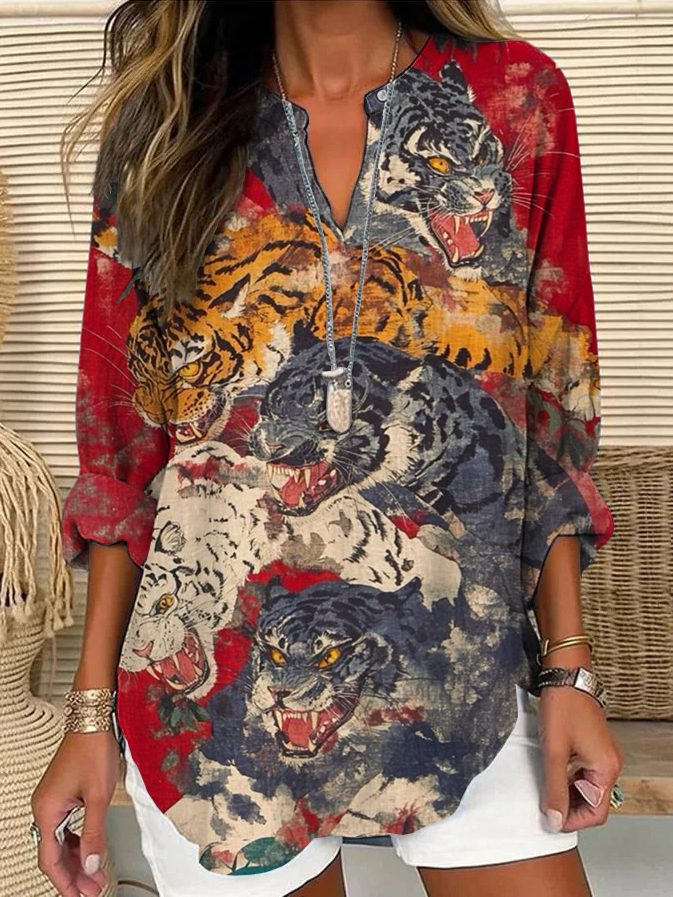 Women's Vintage Tiger Print Linen V-neck Shirt